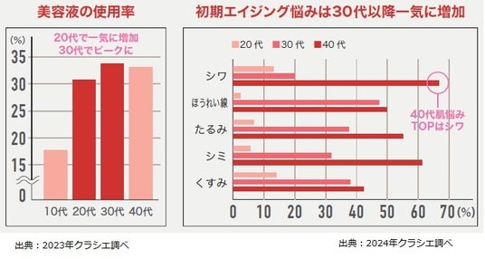 また、当社の調査により、20代から美容液使用率が増えることや、シワ改善を含む初期エイジング悩みが30代以降急増することもわかっており、そのような方に向けて、エイジングケアエントリー層でも毎日のお手入れに追加できる「薬用リンクル美容液」も新発売いたします。「ナイアシンアミド」と「パンテノール」のWの有効成分に加え、「ナノビタミンA」や「スプリングミント」などトレンド成分を配合して、シワの原因にアプローチいたします。
