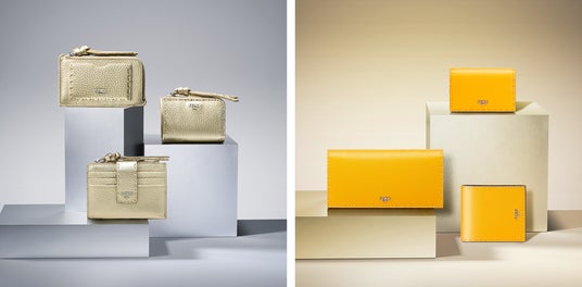 創業以来の伝統を受け継ぎ、ローマの馬具職人の技術とクラフツマンシップを現代に解釈したメゾンのアイコニックな「セレリア(Selleria)」ラインのスモールレザーグッズ。「セレリア」の特徴である最高級カーフレザー「クオイオ ローマ(Cuoio Roma)」を使用し、同色のステッチが丁寧に手作業で施されています。ウィメンズでは人気のアイコンバッグ 「ピーカブー(Peekaboo)」のエッセンスを踏襲した、ホリデーシーズンにふさわしいリュクスなシャンパンゴールドが仲間入り。ノットディテールのジッププルと、トーン・オン・トーンの「FENDI」ロゴが、上品な光沢を放つレザーにアクセントを添えます。メンズでは明るいイエローカラーが新たに登場し、多くのカードスロットを備えた長財布や、コインケース付きの実用的な二つ折り財布、コンパクトなデザインのカードケースなど、実用的で使い心地の良いアイテムを数多く展開しています。ダークブラウンのライニングが、デザインにコントラストを効かせています。