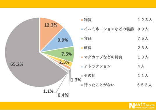 クリスマスマーケットに行って楽しみなことのトップは「雑貨」で123人。次いで多いのは「イルミネーションなどの装飾」(99人)、「食品」(75人)となりました。