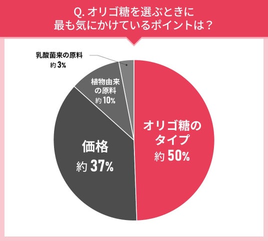 最も多かったのは「オリゴ糖のタイプ」で、半数を占めました。次いで「価格」が約37%。「タイプ」や「価格」は、毎日継続して摂取するものなので、使いやすさやコスパを重視していることがわかります。その他「植物由来の原料」「乳酸菌由来の原料」といった原料を重視している人は、身体への影響を意識して選んでいると考えられますね。