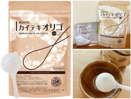 フラクトオリゴ糖とイソマルトオリゴ糖の他、ラフィノース、ラクチュロース、α-シクロデキストリンを含み、便秘傾向者の便通を改善する(排便量・排便回数を増やす)機能がある機能性表示食品です。甘さは感じないので、砂糖のかわりにはなりませんが、サラサラの粉末タイプで、使い勝手が良いと評判です。