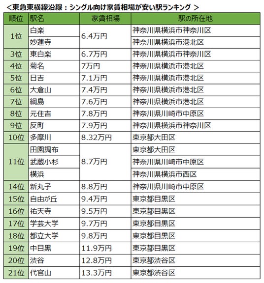 紹介したトップ3の駅は横浜駅から渋谷方面に向かって、3位・東白楽駅~同額1位・白楽駅~同額1位・妙蓮寺駅と連続する3駅がランクインする結果となりました。そして全21駅のうちこの3駅のみ、家賃相場が6万円台に収まっているので、東急東横線沿線でリーズナブルに住める賃貸物件を探すなら、まずはトップ3の駅周辺を重点的に探すとよさそうです。