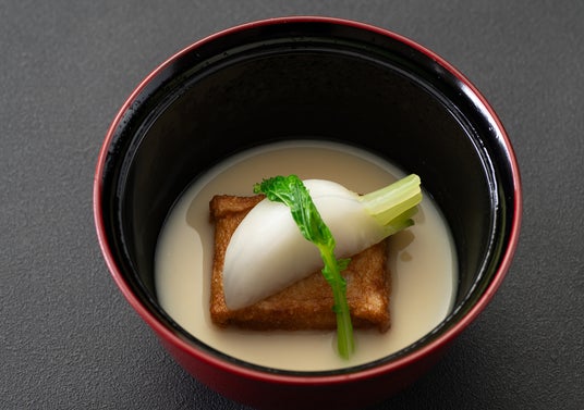 【煮物椀】白味噌仕立て 蓮根餅 揚げ豆腐 芒隠元 溶き辛子