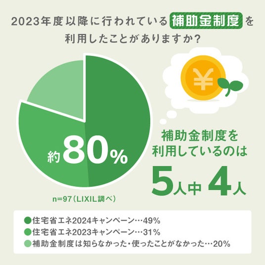 – 「住宅省エネキャンペーン」が開始された2023年度以降に断熱リフォームを実施した人のうち、8割は補助金を活用しお得に断熱リフォームを実施している結果に。