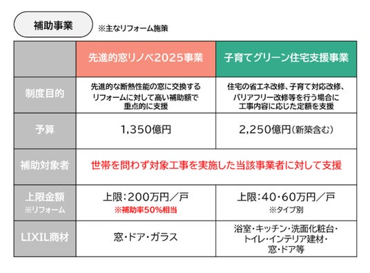 また、国土交通省、経済産業省及び環境省は、住宅の省エネリフォーム等に関する補助制度をそれぞれ実施するとともに、各事業をワンストップで利用可能とするなど連携して支援を行います。LIXILでは、「先進的窓リノベ2025事業」と「子育てグリーン住宅支援事業」に該当する商材をご用意しています。
