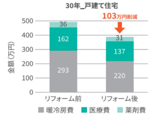 また、浴室と脱衣所、リビングと廊下といった室内の寒暖差が大きいと様々な健康リスクが高まります。LIXILが近畿大学と共同で行った研究では、住宅の高断熱化によりヒートショックなど循環器疾患発症リスクの低減、アレルギー症状の緩和など健康面にも影響することがわかっています。また、この結果、戸建て住宅の窓改修による暖冷房費削減効果は約73万円/世帯・30年、医療費削減効果は約25万円/世帯・30年、薬剤費削減額は約5万円/世帯・30年なり、合計で約103万円/世帯・30年の経済的効果となりました(※4)。