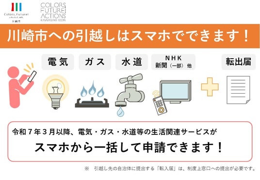 令和7年3月(予定)から、引越しポータルサイト「引越れんらく帳」で、川崎市で使用する電気・ガス・水道や、NHK、一部の新聞、インターネット、固定電話等の手続をスマートフォンから一括して申請できます。同時に、引越し前の自治体に提出する転出届も申請できるほか、川崎市に転入する方は、引越し前の住所における一部の生活関連サービスの手続も申請できます。 このサービスは、株式会社NTTデータ(本社所在地:東京都江東区)が提供するシステムを通じて各種事業者に申請データを提供するものです。