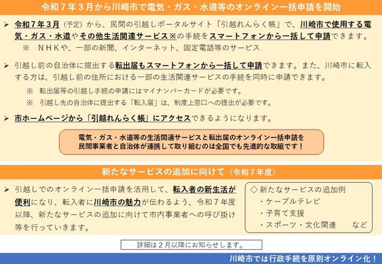 引越しでのオンライン一括申請を活用して、転入者の新生活が便利になり、転入者に川崎市の魅力が伝わるよう、令和7年度以降、新たなサービスの追加に向けて市内事業者への呼び掛け等を行っていきます。