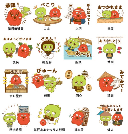 今回配布するスタンプは、東京らしさを“江戸のお仕事”で表現。「ガチャピン・ムック\江戸のお仕事/チャレンジ!」をコンセプトに、江戸時代へタイムスリップしたガチャピン・ムックが、16種類のお仕事にチャレンジする姿を描きます。また、スタンプ内には、のれんや風呂敷、黄八丈(きはちじょう)といった江戸から現代に受け継がれている品々が随所に。表情豊かに動き出すガチャピン・ムックと共に、江戸の文化にも触れていただけます。