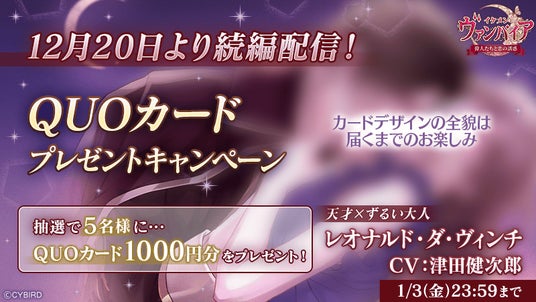 続編配信を記念して、公式X(https://x.com/ikemenvampire)をフォローのうえ該当の投稿をRPいただくと、秘蔵シーンのスチルのQUOカード(1,000円分)が抽選で【5名様】に当たるキャンペーンを実施しています。