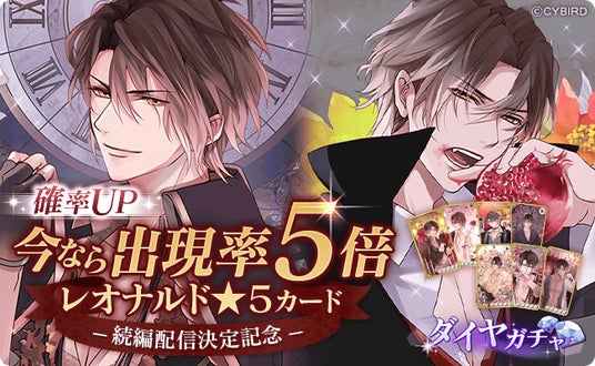 「レオナルド」の周年ビジュアルを含む、美麗彼カードがダイヤガチャに登場しています。開催期間中は、「レオナルド」の星5彼カード9枚の出現率が上がっていますので、ぜひこの機会に手に入れてください。