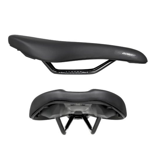 このスポーツサドルは、厚めのクッションとわずかにカーブ形状した座面で、