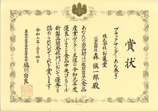 令和元年度の愛知県のふるさと食品コンテストで「ブラックサンダーあん巻き」が最優秀賞(知事賞)を受賞しました。