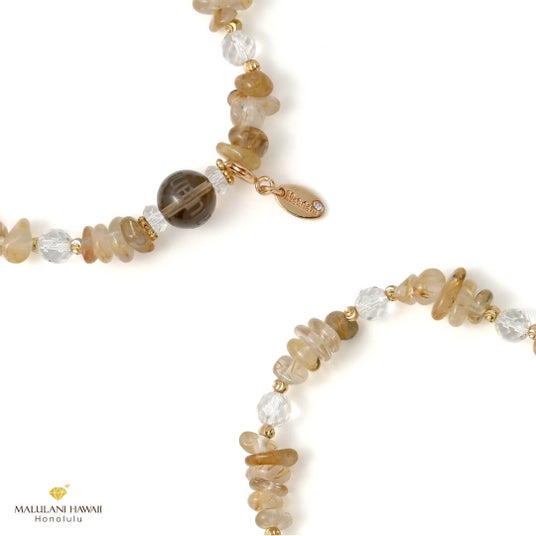 ブレスレットのスモーキークォーツとオリジナルチャームには、ハワイ語で「神のご加護」の意味を持つ 「Malulani」と刻印。