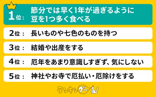 1位は『節分では早く1年が過ぎるように豆を1つ多く食べる』に決定。「厄年の1年が早く過ぎるように」という願いから、自分の歳の数より豆を1つ多く食べるのが良いとされているそうです。2位は厄除けになるアイテム『長いものや七色のものを持つ』。3位は厄払いや厄落としになるという説がある『結婚や出産をする』。4位は『厄年をあまり意識しすぎず、気にしない』。そして5位には『神社やお寺で厄払い・厄除けをする』がランクインしました。