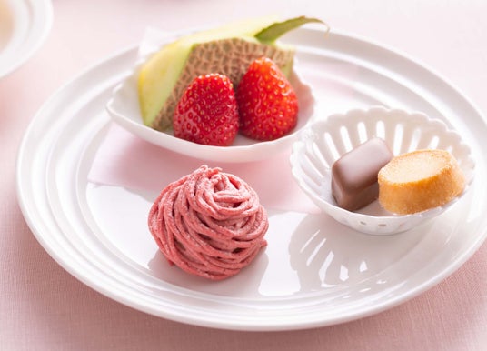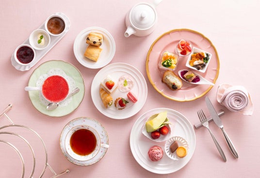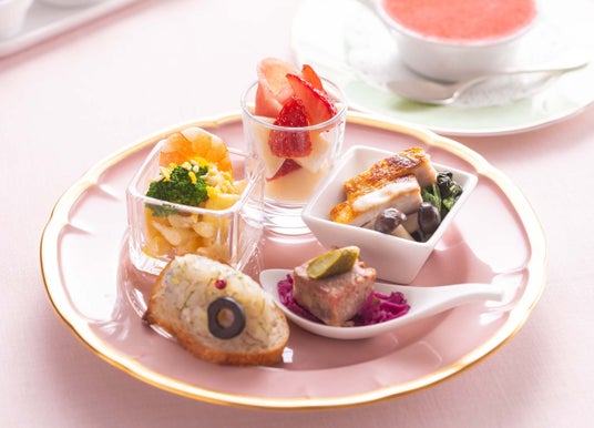 フルーツ(あまおう、メロン) / スコーン2種(いちごチョコチップ、プレーン) / 生ハムとあまおうのカプレーゼ バルサミコソース / 若鶏の炙り焼き きのこのクリームソース / 海老とブロッコリーのミモザ風サラダ / パテ・ド・カンパーニュと赤キャベツのマリネ / スモークした帆立のブルスケッタ / いちごティラミス(別添え) / コーヒー または 紅茶付き