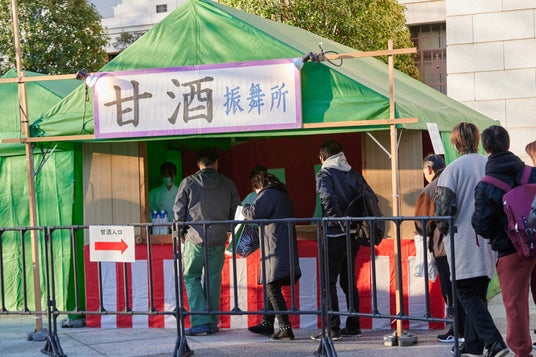 また遊就館本館の前では、甘酒も振る舞われます。こちらはノンアルコールの温かい甘酒です。子どもや車の運転をする人でもいただくことができます。