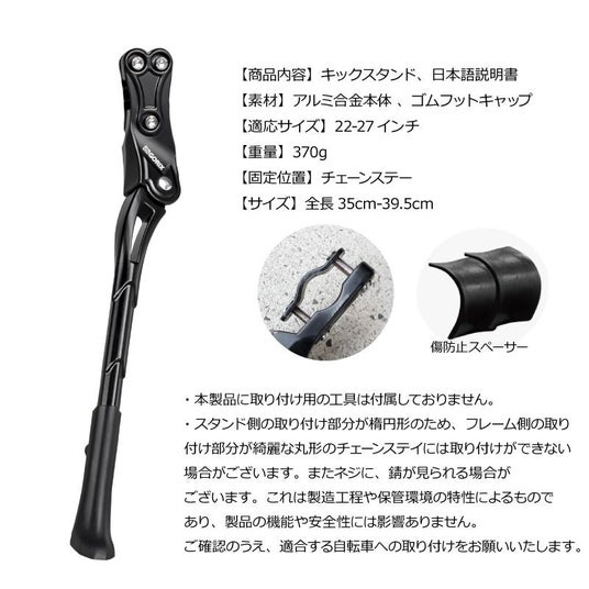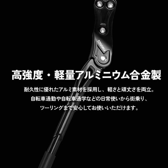 「簡単取り付け!幅広い自転車に対応するキックスタンド」