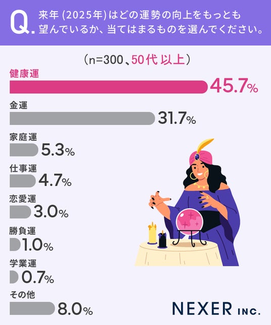 最後に、来年 (2025年) はどの運勢の向上をもっとも望んでいるか、年代別に聞いてみました。