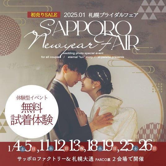 2024年も残すところあと僅か。札幌でフォトウエディングをお考えの方へ、2025年1月に開催する札幌ニューイヤーフェアのお知らせです。街中の開催なので、初売りのお買い物がてらぜひお立ち寄りください。
