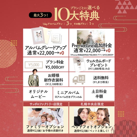 選んで楽しい、選べる10大プレゼント。プランによって最大3つお選びいただけるので、組み合わせるとMAX6万円以上がお得に。