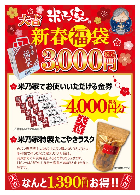 「米乃家2025年新春福袋」は、2025年の年始初営業日から全国※2で発売を開始し、一部店舗では2024年内に先行発売も予定しております。