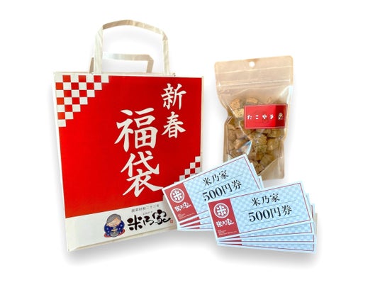 福袋は、購入価格3,000円(税込)に対し、「金券4,000円分(500円券×8枚)」とともに、米乃家オリジナル商品「たこやきラスク」を詰め込んだ、とてもお得な内容です。