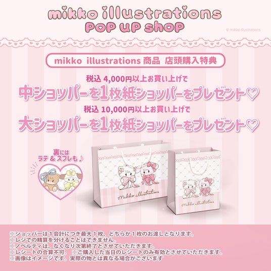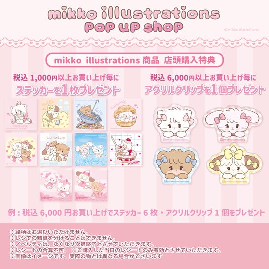 株式会社KThingSは名古屋パルコ西館3Fで2024.12/20~2025.1/13の期間、『mikko illustrations POP UP STORE』を開催します。mikko illustrationsの世界観を感じられる店内やムース、キャミ―、ラテ、スフレの大きなぬいぐるみのフォトスポットをお楽しみ頂けます。ポーチ、クリアファイル、ヘアクリップなど新商品も多数用意し、人気アイテムも充実。名古屋初開催のPOP UPにぜひお越しくださいませ。