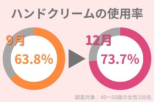 調査の結果、12月現在、40代女性のうち、73.7%と多くの女性がハンドクリームを使用して、手を保湿していることがわかりました。9月に同様の調査を行った際は、63.8%の方がハンドクリームを使用して保湿をしており、9月から12月で使用率が約10%増加したことがわかります。