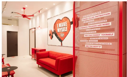 店内は、パッションとパワーに満ちあふれた赤をキーカラーに、スタイリッシュなNYテイストを取り入れ、女性たちが通い続けたくなる空間を設計しました。またマシンが立ち並ぶスタジオは、赤いライトが照らされた暗闇空間で、アップテンポな音楽にあわせながらイマーシブなフィットネス体験が可能です。