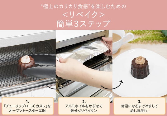 たったこれだけでカリカリのおいしさが抜群に復活します。リベイクしている間にお好みのお飲み物を入れて、優雅に『チューリップローズ カヌレ』のおいしさを楽しんで。