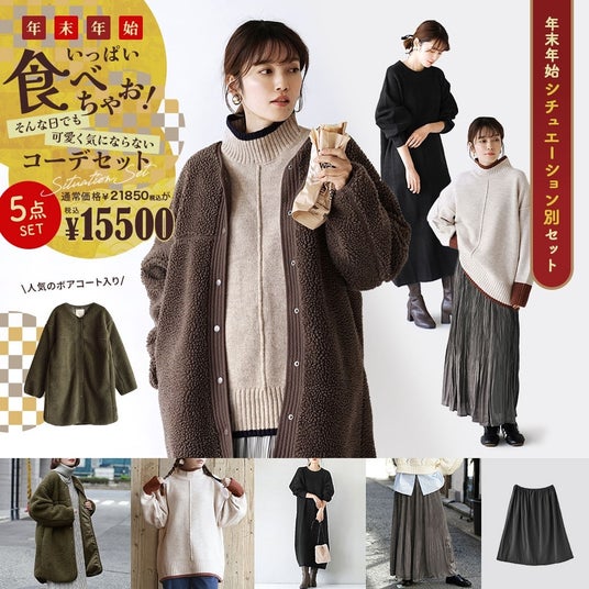 年末年始を満喫する5つのコーデセット。通常価格よりも4,000~5,000円お得になってコスパよし。年末年始だけでなく、骨格別コーデやあなただけのためのスタイリングセットなど様々なコーデセットを用意