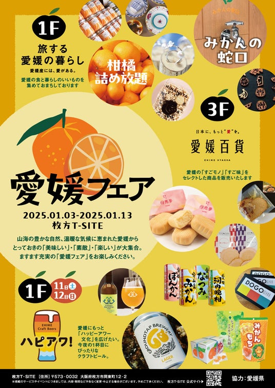 枚方T-SITE(大阪府枚方市)は、2025年1月3日(金)から1月13日(月・祝)まで、「愛媛フェア」を開催します。海と山に囲まれた豊かな自然と温暖な気候に恵まれた愛媛から、食と暮らしの逸品をお届けします。愛媛の食と暮らしのいいものを集めた「旅する愛媛のくらし」フェアや、愛媛県認定の優れた商品や伝統的な特産物を集めた「愛媛百貨」、愛媛生まれのクラフトビールなどをぜひお楽しみください。