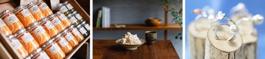 その他、愛媛で話題のジャムやピクルス、ポン菓子や、国の伝統工芸品に指定されている砥部焼の食器、鉄のアクセサリーなどもお手に取っていただけます。養殖日本一を誇る宇和海の真珠を使ったアクセサリーの販売では、セミオーダーも承ります。