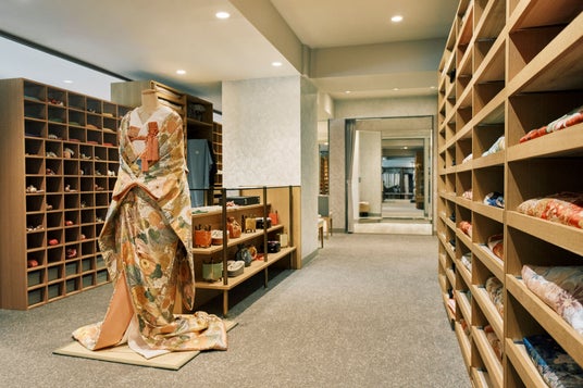 みなとみらいの大通りに面した直営店は、透明感のある外観と、高い天井から光が差し込む2階の店内に、「紋付袴」「白無垢」「色打掛」などのご新郎・ご新婦向けの和装や、「黒留袖」「色留袖」などの親御様、ご列席者向けの衣装を豊富にご用意しております。