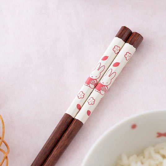 今回発売する和食器「おはなみ」シリーズ3種のいずれにも、ミッフィーたちがお花に囲まれた、一足先に春を感じられるデザインがあしらわれています。シンプルな白地にあざやかなピンク色でお花や生き物を描いた器や、末広がりで縁起のいい形とされる八角形のお箸は、新しい一年を迎えるアイテムとしておすすめです。