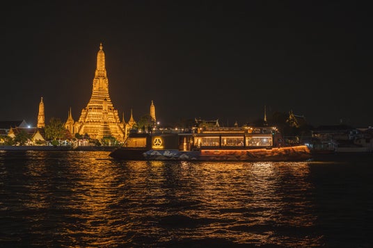 また、夜のバンコクを彩る船外の景色も見どころの一つです。3時間のクルーズでは、「王の川」として知られ、バンコクの歴史や文化において重要な役割を果たしてきたチャオプラヤー川沿いに点在する寺院や活気ある川辺のマーケット、ラーマ8世橋などの象徴的な名所を巡ります。ライトアップされた歴史的建造物と光が反射した川面を眺めながらの食事は、昼間の喧噪とは異なる幻想的なひとときを演出します。
