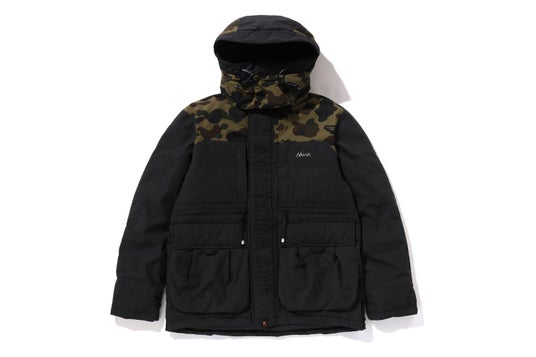 もう1型は、NANGAの定番「HINOC DOWN JACKET(ヒノックダウンジャケット)」をベースに、BAPE(R)︎のスノーボードジャケットのディテールを取り入れ、前立てに“A BATHING APE”のタイポグラフィを刺繍しました。肩周りとヨーク、後ろ袖をBAPE(R) CAMOの切り替えでアレンジしています。