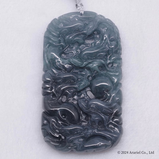 深淵な青色の青翡翠に宿る九頭龍。天を目指すように上昇す龍の力強さと神聖さが際立つペンダント。握り石としてもおすすめ。(お値段:税込333,333~444,444円)