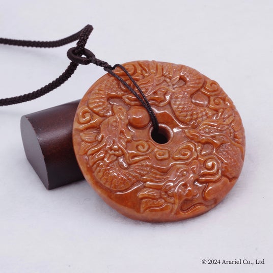 炎のような赤翡翠にパワフルな九頭龍が円を描く円型タイプのペンダント。真ん中に孔(空洞)のある円型は無限の可能性や調和、循環を表す。(お値段:税込555,555円)