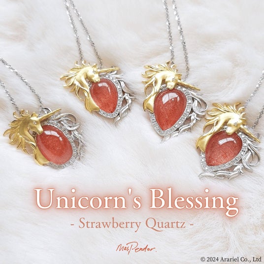 幻のカザフスタン産ストロベリークォーツを使用したユニコーンペンダント。2024年12月14日発売のMaspender.フラッグシップジュエリー「Unicorn’s Blessing」シリーズ。