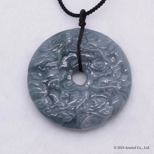 瑞々しい青翡翠にパワフルな九頭龍が円を描く円型タイプのペンダント。真ん中に孔(空洞)のある円型は無限の可能性や調和、循環を表す。(お値段:税込555,555円)