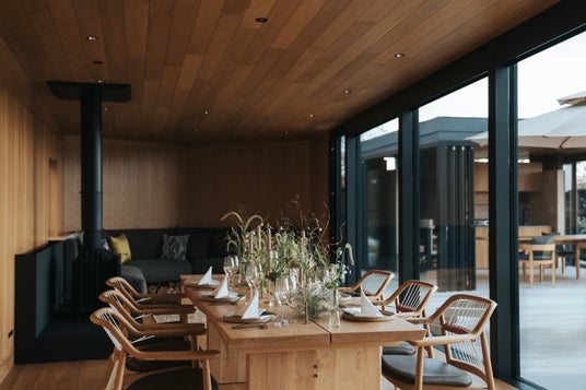 全天候型のオープンテラス。屋外と同じく広大な森林のロケーションが広がる。