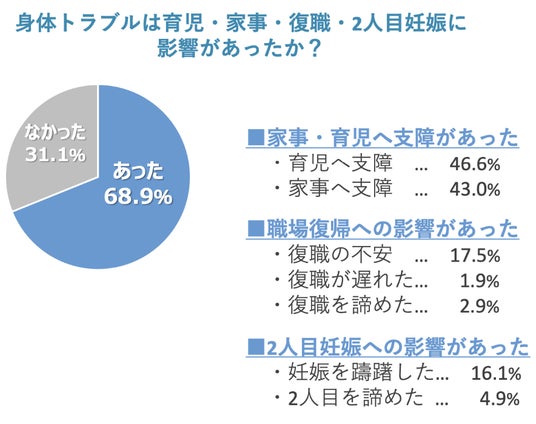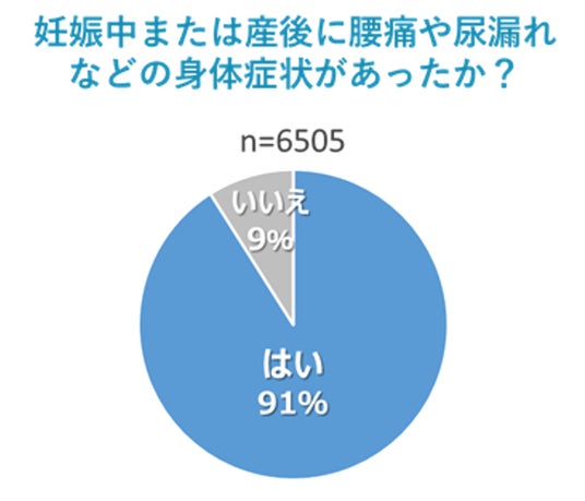 一般財団法人 日本女性財団の調査によると、出産経験のある調査対象女性の約9割が妊娠中や産後に腰痛や尿漏れなどの身体的トラブルを経験し、家事・育児・復職・2人目妊娠に影響を及ぼしていることが分かりました。そして、それら身体的トラブルの中で最も多かったのは腰痛でした※1。
