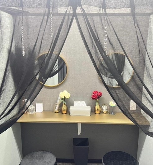 – エントランスを進むと、プリンセス通りへ進みます。お客さまにお待ちいただくウェイティングルームにはちょっとしたお菓子とハート形の椅子をご用意しました。クッションにもこだわりがあり、お待ちいただいている時間も楽しく過ごせます。