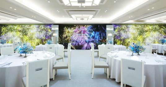 今回のプロジェクションマッピングは、白を基調とした人気の披露宴会場「フェアリー」に導入。壁面一面に映像が投影され、ゲストの皆様に臨場感のある特別な体験をご提供します。映像は、現在5パターンより選んでいただけますが、これからさらにバリエーションを増やし1月末を目途に30パターンを超えるコンテンツをご用意いたします。