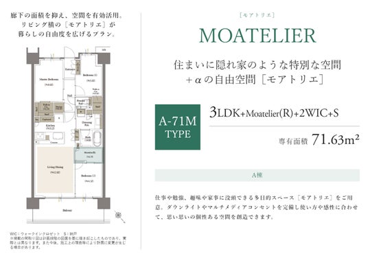 70平方メートル 台の3LDKを中心に多様なライフスタイルに対応した80タイプ超のプランニングを設定。+αの空間としてライフステージに合わせて可変性のある自由空間『モアトリエ』を設定するプランを多数設けました。書斎のように利用することでリモートワークやお子さまの勉強部屋や大規模な収納として活用することができる空間です。また、お客さまの声で育てられた住まいのアイデアをカタチにした商品企画である『LIVIO IDEAS(リビオアイデアズ)』(※4)も採用しております。