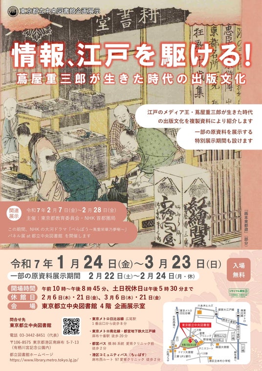 令和7年2月7日(金)から2月28日(金)までの間、NHKの大河ドラマ「べらぼう~蔦重栄華乃夢噺~」パネル展at都立中央図書館(主催:東京都教育委員会・NHK 首都圏局)を開催します。