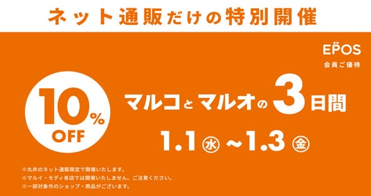 丸井グループ(東京都中野区、代表取締役社長:青井 浩)は、マルイの公式ネット通販「マルイウェブチャネル」限定で、2025年1月1日(水・祝)~1月3日(金)の間、エポスカード会員さまご優待キャンペーン『お正月 マルコとマルオの3日間』を開催いたします。期間中、エポスカードのクレジット払いで10%OFFにてお買物いただけます。