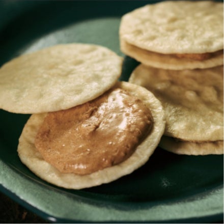 1.国産の米で作られたパリパリと香ばしい煎餅には、風味豊かなクリームサンド。洋菓子の発想で生まれた口どけなめらかなクリームは、ほんのりと塩気のある煎餅と美味しさを引き立てあいます。ビターキャラメルは、キャラメルの配合の調整を重ね、ビターで芳醇なクリームに仕上げました。